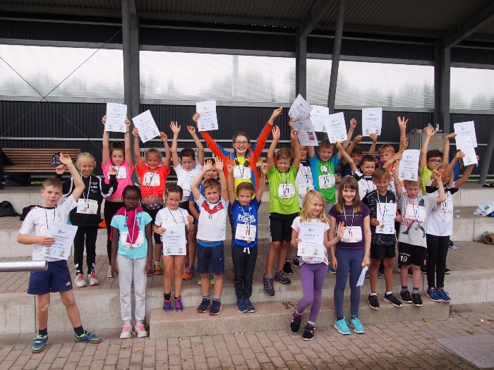 Doch wie vor jeder Sporteinheit stand auch an diesem Tag das Aufwärmen mit Koordinationsübungen und einem kurzem Lauf-ABC. Da wurde neben Spaß auch die Konzentration gefordert und gefördert. Im Anschluss wurden jahrgangsübergreifende gemischte Teams gebildet, die aus 5-6 jungen Athleten bestanden. Denn Leichtathletik im Kindesalter ist auch eine Gruppensportart mit viel Dynamik. Diese Teams absolvierten dann einen Parcours aus vier Stationen. Dabei wurde von der Hindernis-Sprint-Staffel über den Wurf mit Wurfstäben und dem Zonenweitsprung bis hin zum Stabweitsprung alles abgedeckt. Diese leichte Heranführung an den Stabhochsprung war zwar vielen Kindern unbekannt, erfreute sich aber großer Beliebtheit. Zwischendurch gab es immer wieder Pausen, in denen man mit Getränken, Obst und Müsliriegel neue Kräfte sammeln konnte. Nachdem alle Kinder die Stationen absolviert hatten, gab es die Gelegenheit, die noch fehlenden Disziplinen für das Deutsche Sportabzeichen zu absolvieren. Glückliche Gesichter dann bei der Verleihung von Urkunden und verdienten Medaillen für alle Teilnehmer, die prima mitgemacht hatten, und mit müden Beinen nach Hause gingen.