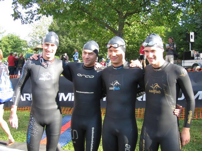 Die Athleten der LG Steinlach kamen mit den Strecken und den Bedingungen insgesamt sehr gut zurecht. Daniel Groß blieb knapp unter 30 Minuten beim Schwimmen. Jens Kalmbach benötigte drei Minuten mehr. Christoph Groß kam nach weiteren 50 Sekunden und Tommy Janson schließlich nach gut 35 Minuten aus dem Wasser. Beim Radfahren waren alle vier ähnlich stark und schnell unterwegs mit Zeiten zwischen 2:22 h und 2:28 h. Auch beim Laufen konnten die LG Steinlach-Triathleten überzeugen. Schnellster der Truppe war hier Tommy Janson mit 1:26:31 h, dicht gefolgt von Daniel Groß mit 1:26:59 h und Christoph Groß mit 1:27:44 h. Jens Kalmbach kam endlich ohne Krämpfe gut in 1:34:50 h durch das Rennen. Schade, dass keine Mannschaftswertung in der Baden-Württembergischen Meisterschaft ausgeschrieben war, denn der Mannschaftstitel wäre mit diesem ausgeglichenen Ergebnis an die LG Steinlach gegangen. Nicht zu schlagen war auch dieses Jahr wieder Thomas Bosch - und das trotz einer Panne und einem Sturz beim Radfahren. Mit einer grandiosen Laufbestzeit (1:17:13 h) konnte er dieses Jahr das Rennen erst spät beim Laufen für sich entscheiden. Auf den letzten Metern erkämpfte sich Thomas Bosch noch den Gesamtsieg beim Breisgau Triathlon, den Baden-Württembergischen Meistertitel und logischerweise auch die Altersklassensiege in M25 und wiederholte damit seine Vorjahreserfolge.