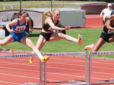 Tom Hoch wollte es direkt nach dem Pfingsturlaub bei den M14 im Speerwurf wissen. Auch er hatte etwas Schwierigkeiten gleich wieder technisch optimale Würfe zu absolvieren. Seine beiden weitesten Versuche landeten jeweils bei guten 35,05m. Aber damit fehlten ihm 30cm zum Erreichen des Finales – er wurde Neunter. Noah Handte hatte er sich erst auf den letzten Drücker mit neuer PB für die Süddeutschen qualifiziert. Nach anfänglicher Aufregung und daraus resultierenden Anlaufschwierigkeiten machte er seine Sache im Wettkampf dann gut. Er übersprang 2,40m und 2,60m jeweils im zweiten Versuch. Damit kam er bis auf 2cm an seine PB heran. Bei der nächsten Höhe von 2,80m musste er dann die Segel streichen; etztendlich hatte ihm der erste Fehlversuch über 2,40m die Finalplatzierung gekostet. Lea Weithoffer absolvierte einen spannenden Hochsprung. Bei ihrer Anfangshöhe von 1,40m zeigte sie im dritten und letzten Versuch ein großes Kämpferherz und vermied das frühe Aus. Diesen Flow nahm sie in die nächste Höhe mit und sprang gleich im ersten über 1,42m. Erst an der neuen PB von 1,50m scheiterte sie. Der Lohn war ein schöner 12.Rang.