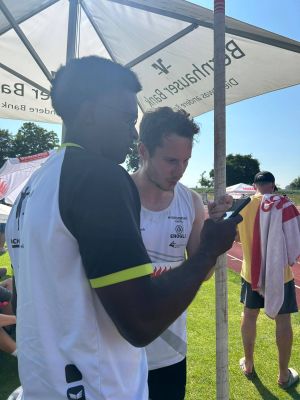 Ganz anders die Emotionen bei Dieudonne Zchekap (U18). Er hat sich im letzten Jahr mit vielen neuen Disziplinen im Training auseinandersetzen müssen. Dabei machte er große Fortschritte und konnte die nun auch im Zehnkampf auf die Bahn bringen. In acht Disziplinen konnte er neue PB´s aufstellen. Lediglich bei den 110m Hürden kam er völlig aus dem Rhythmus, so dass er im 5er-Rhythmus durchlief und Zeit verlor. Aber unter dem Strich bleibt der Stolz auf seinen ersten absolvierten Zehnkampf sowie die Freude über ein Gesamtergebnis von 4.466 Punkten.